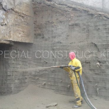 Szerkezet megerősítés, munkagödrök megtámasztása lövellt beton segítségével.